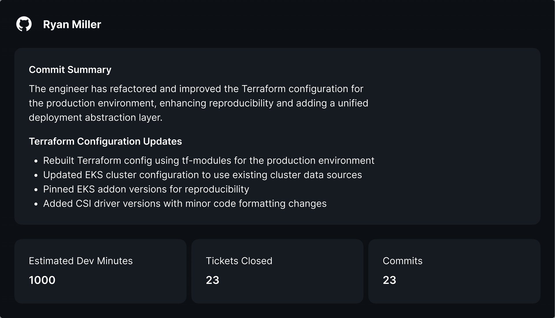 AI-powered summaries of what each developer accomplished from code analysis.